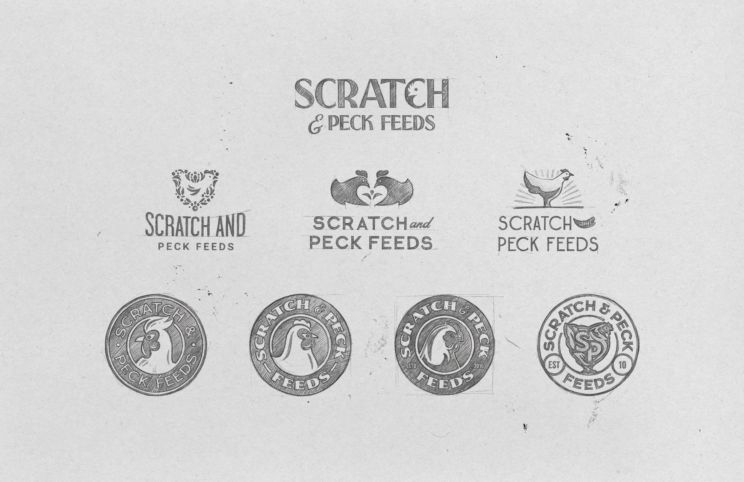 Website: Murmur CreativeDiscoveryWhile we began the initial logo process, it was decided early on that we wanted to keep the primary focus on the hen. To make sure we were embodying our strategic brand pillars, our chicken had to exude confidence and a friendly nature. Above are early explorations of the Scratch & Peck Feed logos that we concepted.